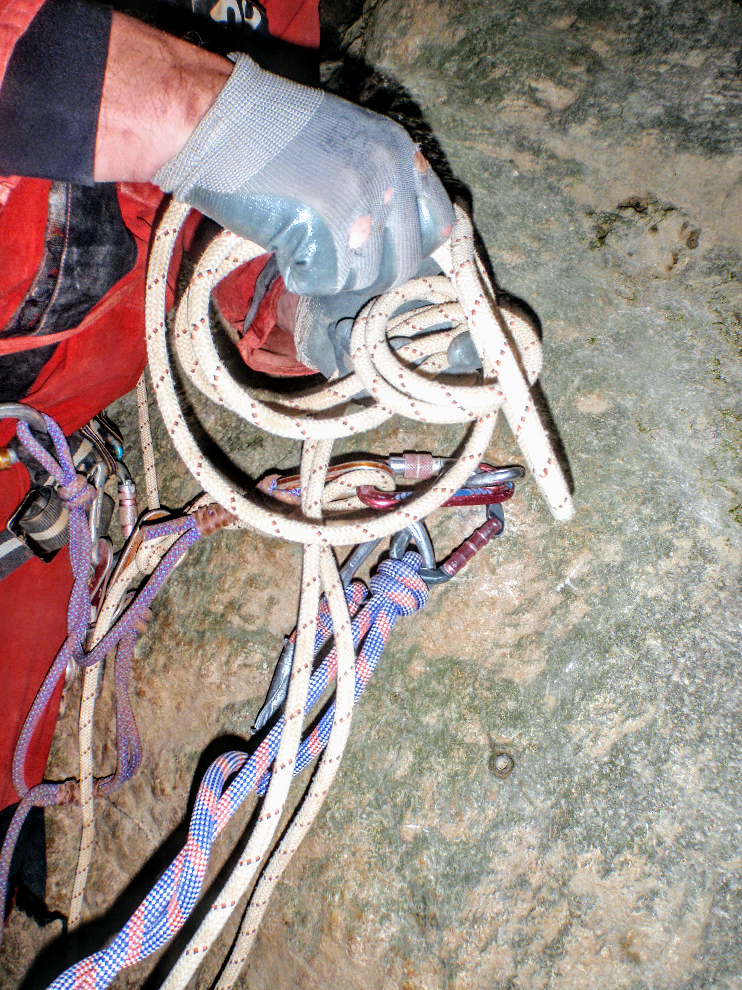 Alex continue l’équipement en prenant bien soin de faciliter le retour des équipiers à base de moulte main-courante et de mousquetons suspendus.